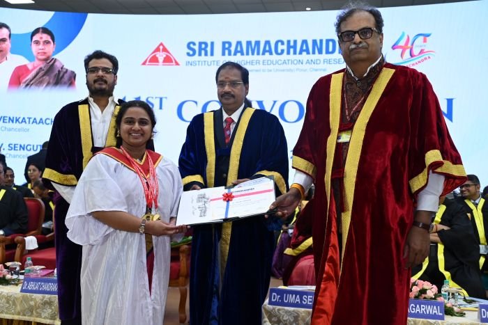 The 41st Convocation of Sri Ramachandra Institute of Higher Education and Research (SRIHER) was held on April 17 with Dr. Abhijat Chandrakant Sheth, Chairman of the National Medical Commission and President of the National Board of Examinations, Ministry of Health & Family Welfare, as the Chief Guest and delivered the convocation address. The Pro-Chancellor Mr. R. V. Sengutuvan conferred degrees on 902 graduates, including Ph.D., postgraduate, and undergraduate students in medical, engineering, and management disciplines. Chief guest presented 53 gold medals to meritorious students. Dr. Janavi Sridhar bagged three gold medals for outstanding performance in MBBS examinations.